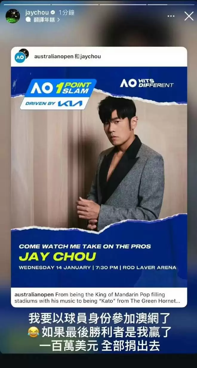 周杰伦:我要以球员身份参加澳网了,如果最后胜利者是我,贏了的一百万美元全部捐出去。