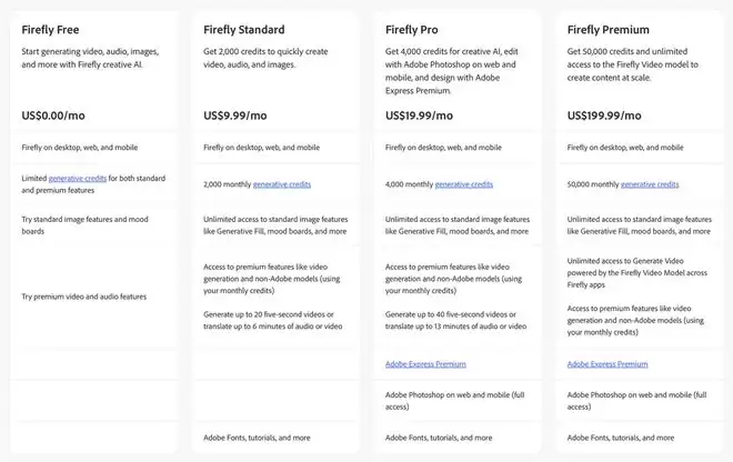 据了解,目前Adobe Firefly平台已整合了Adobe自家以及OpenAI、Runway、Black Forest Labs、Pika、Ideogram、谷歌等各大厂商的图像、音频和视频模型。该平台采用“生成式点数”订阅机制运行,其中Standard方案月费为9.99美元,约合人民币69.8元,每月包含2000点生成额度;Pro方案月费19.99美元,约合人民币139.7元,提供4000点额度;而Premium方案月费高达199.99美元,约合人民币1398元,提供多达5万点的生成额度。
