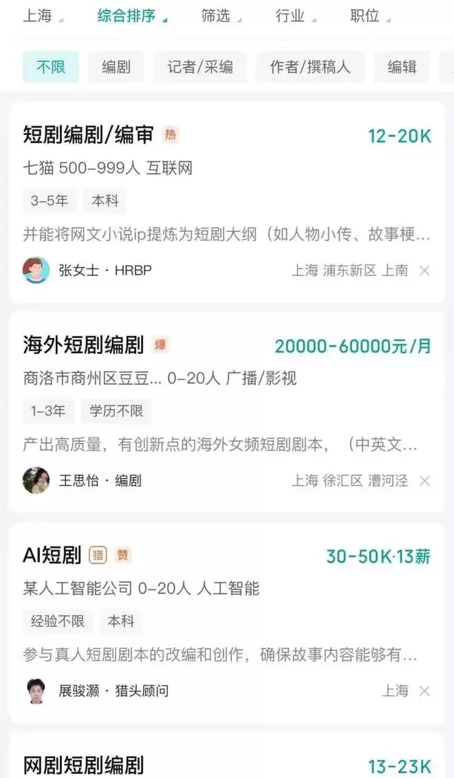 娜娜最终还是被挡在了门外。她告诉记者,除了无法适应与学院派割裂的创作模式,劝退她的还有行业对新人筑起的高墙。在尝试面试相关岗位时,她发现,在如今的短剧圈,手握一部已播出且署名的代表作,几乎已成为入职相关企业的“硬通货”。