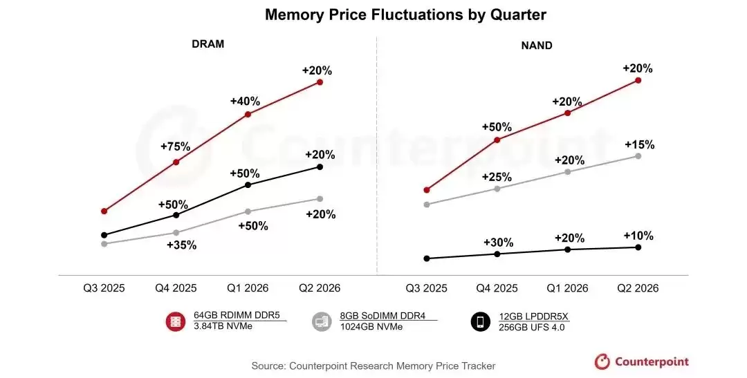 该机构预计,此轮涨势将在今年进一步强化,并对智能手机、服务器及整机制造商的物料清单成本结构产生深远影响。Counterpoint的最新预测数据显示,去年第四季度存储价格已大幅上涨40%至50%,今年第一季度预计将再涨40%至50%,第二季度则有望继续攀升约20%。以64GB RDIMM为例,其价格已从去年第三季度的255美元跃升至第四季度的450美元,并预计将在今年3月进一步上涨至700美元。