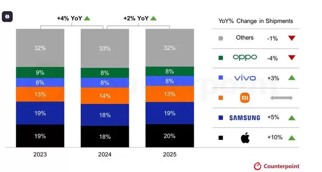 所有人都在等待数据调研公司发布关于2025年全球及国内智能手机领域的报告,毕竟竞争如此激烈,谁都想知道谁能在2025年笑到最后。如今Counterpoint Research的数据已经出炉,可以说2025年全球范围内智能手机市场真的变天了。