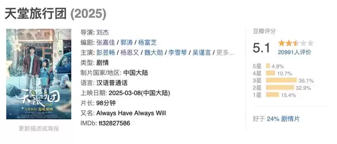 本片导演刘杰,最近几年作品,2016年霍建华主演《捉迷藏》豆瓣5.4分,2018年杨幂主演《宝贝儿》豆瓣5.3分,按这个趋势《天堂旅行团》豆瓣5.2分?
