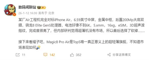 快科技1月12日消息,自苹果发布iPhone Air之后,国内多家厂商纷纷对类似超薄机型进行了市场评估,这其中包括小米、华为、荣耀等品牌。