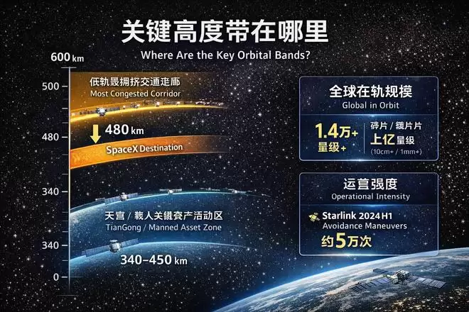 讨论低轨拥挤,首先要把高度带的关系放到一张图里理解。公开报道提到,天宫空间站轨道高度可上探到约450公里量级;而星链此次被讨论的下调目标高度约480公里,舆论里常提到的星链工作高度也多在500–600公里带。两者处在相邻高度带,这意味着一旦某个高度区间的交通密度上升、机动更频繁,载人航天这类关键资产对安全冗余的感受会更直接、更敏感。