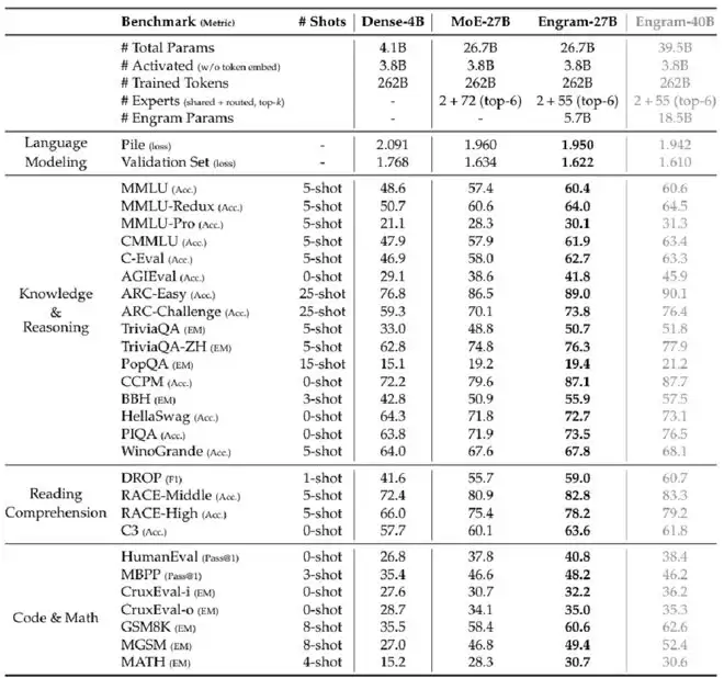 具体而言,DeepSeek训练了四个模型:Dense-4B、MoE-27B、Engram-27B、Engram-40B。训练时的语料库、分词器都使用了相同的设置,而后两个模型引入了Engram机制,用于研究在模型大小不变和Engram进一步扩展后的特性。
