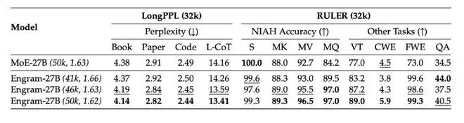 实验结果显示,由于Engram模块接管了局部依赖的建模,它为模型的注意力机制腾出了容量,使其能更专注于处理全局上下文。因此,Engram架构在处理超长文本和长程推理任务上比传统架构表现更好,具体表现如下: