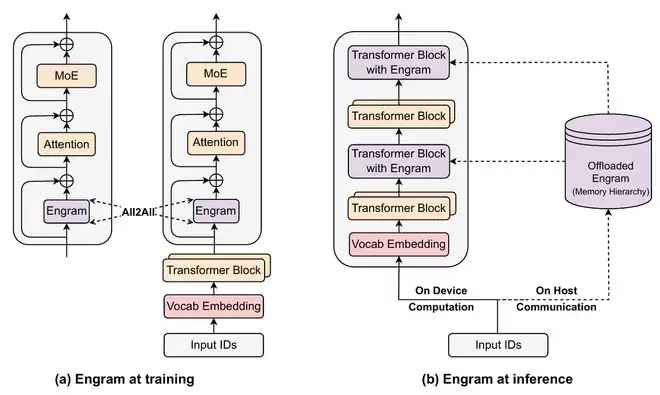 层次化存储:基于自然语言-gram的Zipf分布特性,可采用多级缓存策略,高频嵌入存放于GPU HBM或主机DRAM,低频嵌入置于SSD。这使Engram能扩展至超大规模记忆,同时保持低延迟与高效率。