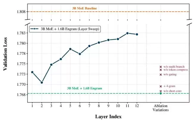 在架构消融实验中,研究人员发现将Engram模块放在较浅的层,如第2层,效果最好。这样可以尽早卸载模型背负的局部模式重建任务,让后面的深层网络专注于复杂的全局推理。