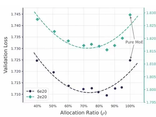 实验发现,在有限资源下,把所有空闲参数都给MoE(也就是纯MoE模型)不是最优解,最好的效果是大约75%-80%给MoE,其余20%-25%给Engram。