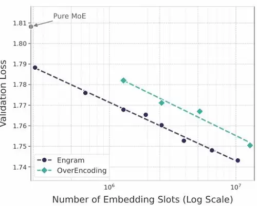 DeepSeek还观察到,增加记忆槽位数量能持续、稳定地降低验证损失,这意味着Engram提供了一个可预测的Scaling新手段:增大记忆容量持续带来收益,而无需增加计算量。