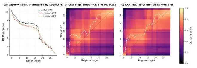 首先是模型深度与表征分析,DeepSeek团队通过LogitLens分析显示,Engram模型在早期层就能更快地收敛到最终预测结果,因为它通过查表直接获取了静态知识,不需要像传统模型那样通过多层计算来重组基础特征。