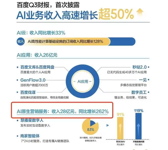 2025年第三季度,百度在其财报中首次单独披露了AI原生营销服务收入28亿元,同比激增262%,明确将这一业务板块作为公司增长的重要驱动力之一,这说明AI元素已经从实验阶段走向商业化落地,并成为收入增长极之一。