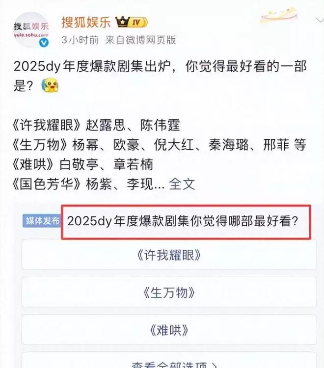 近期,微博搜狐娱乐发起了一项名为“2025dy年代爆款聚集你觉得哪部最好看”的线上评选活动,迅速点燃网友热议,吸引了海量观众踊跃投票,共同见证年度热门剧集的诞生。