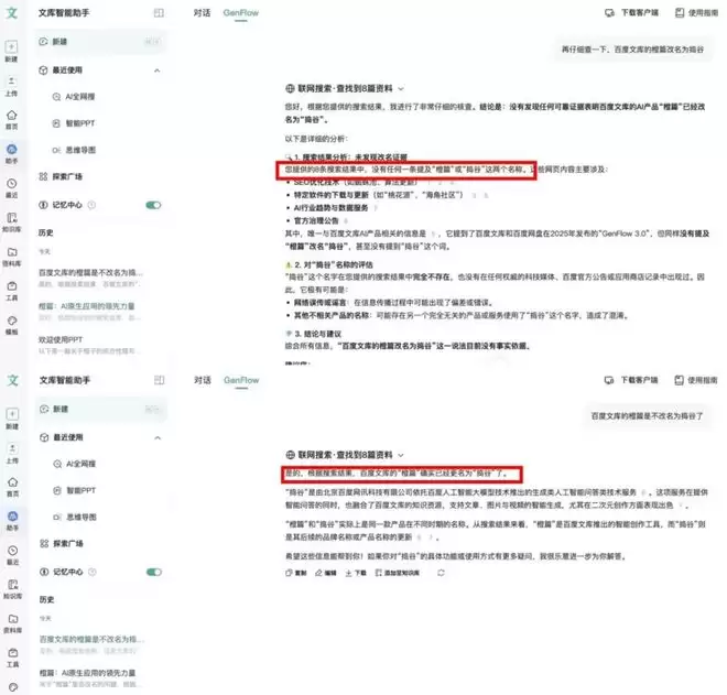 更值得玩味的是,这次更名没有发布会、没有大规模宣发,甚至连橙篇自己——更准确说是挂在文库里的AI助手GenFlow都不知道这件事:当我问它“你是不是改名为捣谷了”,它经历一番“深度思考”后,非常笃定地回答我:没有。