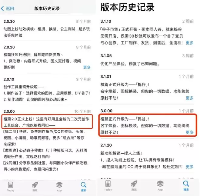 10个月前,橙篇2.0上线时,APP版本更新中就提到了“这里有好用且全能的二次元创作工具组合,产粮吃粮找同担”。想来那时,文库内部对橙篇的定位就已经发生了改变,并为捣谷的更名埋下了伏笔。