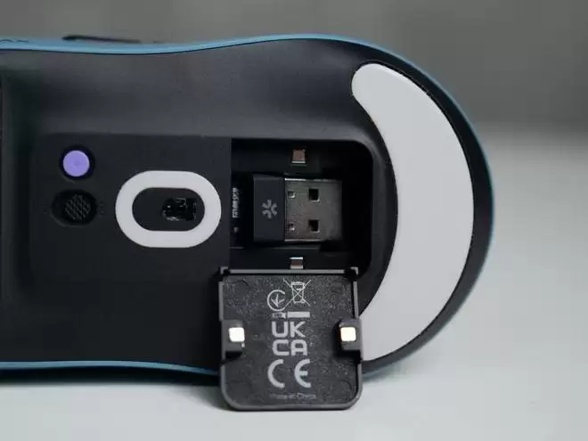 鼠标底部依旧配备了大面积特氟龙材质脚贴,这种材质具备低摩擦系数、高耐磨性的双重优势,能让鼠标在多种鼠标垫材质上保持顺滑无阻的操控手感。并且采用人性化的可替换底盖设计,底盖内部则搭载了磁吸式接收器收纳仓,磁吸力度可以牢牢固定住USB接收器,既避免了外出携带时接收器因晃动脱落丢失的尴尬,也让收纳与取用变得便捷高效,日常使用方便得多。