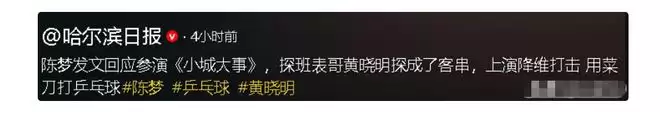 《小城大事》的演员表中,惊现陈梦!奥运冠军陈梦跨界演戏,居然拿着菜刀当乒乓球拍,把表哥黄晓明打得毫无还手之力!本来是冲着赵丽颖和黄晓明的主线剧情来追剧的,结果不少人直接被陈梦的“降维打击”圈了粉,拍