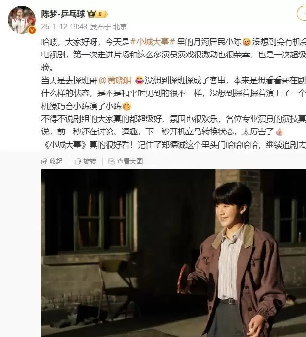 来源:青岛日报1月12日中午,由黄晓明、赵丽颖等人主演的电视剧《小城大事》最新微博发布拍摄花絮:“神秘乒乓大神突袭月海”。视频中,乒乓球运动员陈梦出镜,本色出演“乒乓大神”小陈,还拿着“菜刀”和黄晓