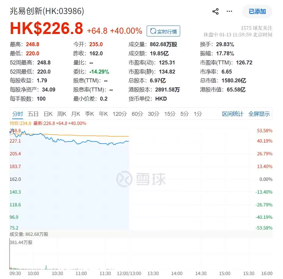 上市首日,兆易创新开盘价报235港元/股,较发行价大幅高开近50%。截至午间休盘,公司股价报226.8港元/股,总市值约1580.26亿港元,其A股总市值也在盘中突破1800亿元人民币,创下上市以来的新高。