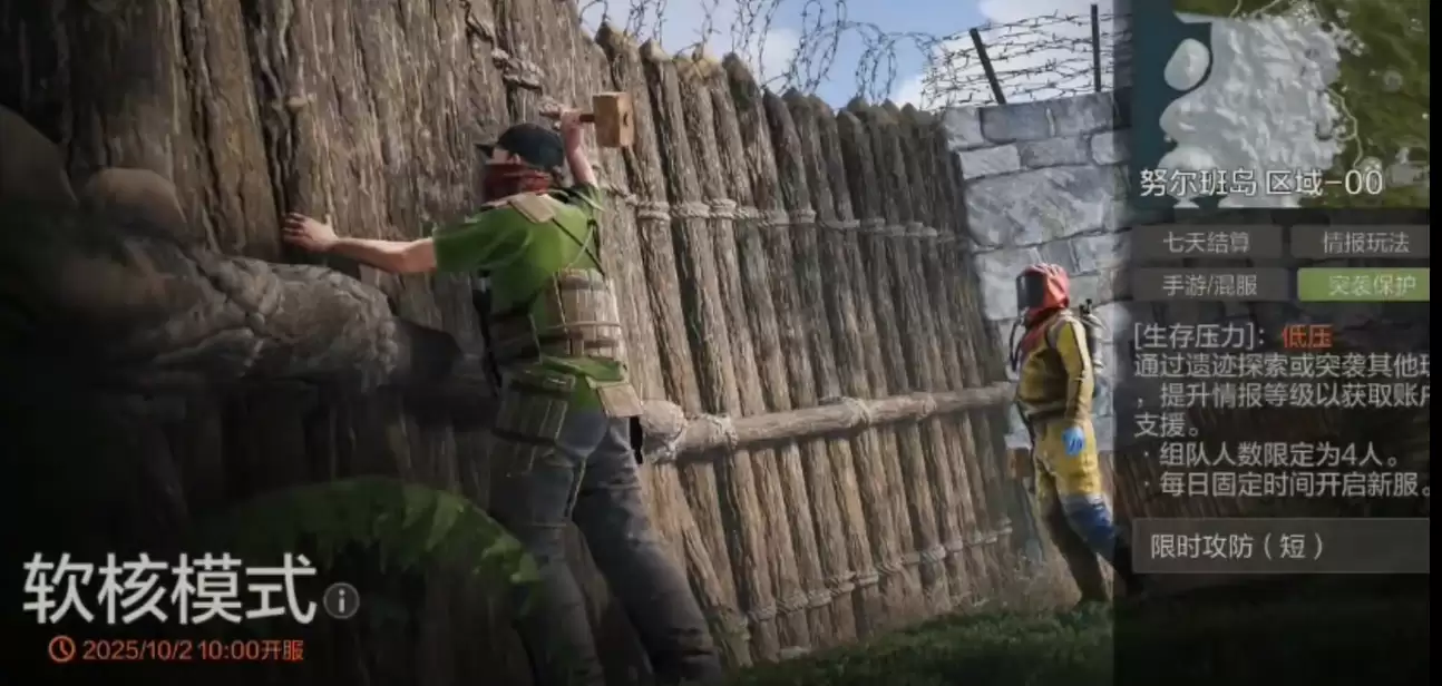除了这些持续时间比较长的模式,还有个领地攻防模式,这个玩起来就快多了。不需要从头开始慢慢发展,进去就直接分成进攻方和防守方开干。进攻方拿着各种爆炸物,目标就是炸掉对面的领地柜,防守方则要想办法守住。每局的武器和建筑类型都不太一样,有时候是低科技阶段用弓箭和木头墙,有时候是高科技阶段用火箭筒和金属墙,变化挺多的。这个模式特别考验团队配合,进攻的时候要有人吸引火力,有人负责破墙,防守的时候则要合理布置陷阱和火力点。一局打下来也就十几二十分钟,节奏很快,而且同样有双倍经验加成,适合时间不多但又想快速获得经验的玩家。