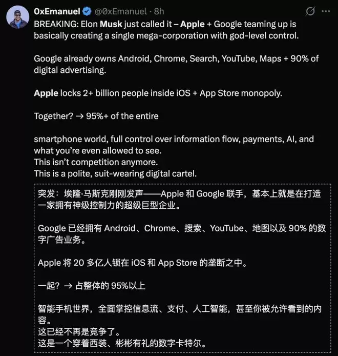 而这次合作,无疑极大地增强了谷歌的市场地位,甚至马斯克表示,苹果和谷歌联手,基本上就是一家拥有神级控制力的超级巨型企业。