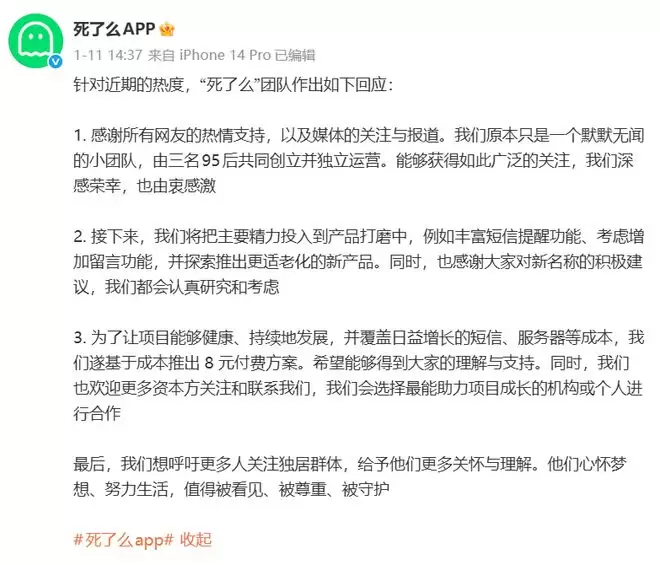 1月11日,“死了么”团队在微博上针对近期的热度作出了回应,表示接下来将把主要精力投入到产品打磨中,例如丰富短信提醒功能、考虑增加留言功能,并探索推出更适老化的新产品。