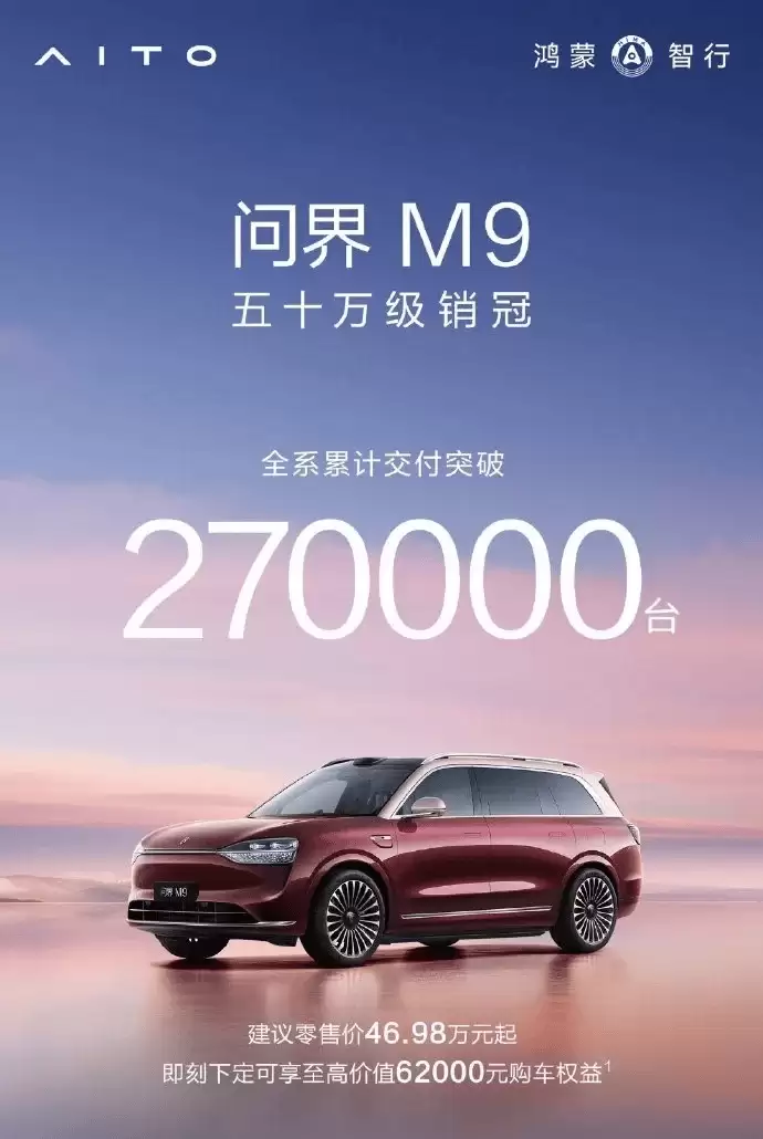目前,问界的产品线已覆盖多款SUV车型,包括M9、M8、M7和M5,形成了完整的产品矩阵。其中,问界M9自上市以来表现尤为突出,两周年的累计交付量超过27万辆,创造了50万元级车型的交付纪录。