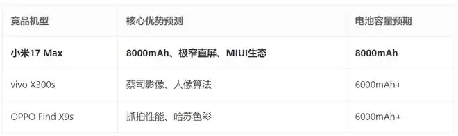 而且目前的消息指出小米17 Max预计将于今年3月至4月集中发布,这一时期,友商也将推出类似定位的产品,如vivo X300s和OPPO Find X9s。