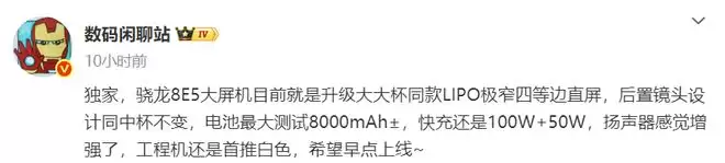 同时爆料显示,该机正在测试“8开头”的新型硅电池,容量预计达到8000mAh±,在智能手机普遍还在6000-7000mAh徘徊的时代,8000mAh几乎是“降维打击”。