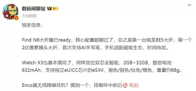 OPPO Watch X3:定位双芯全智能,配备2GB+32GB存储,电池632mAh,最关键的是它支持独立eUICC芯片的eSIM功能,这意味着它能真正脱离手机独立使用;配色方面提供了黑色、银色、钛色和橙色,约68g的重量也算中规中矩。新款Enco降噪耳机:目前已经摸到样机,预计排期在年中前后,作为口碑极佳的Enco X系列的续作,音质和降噪深度依然值得期待。