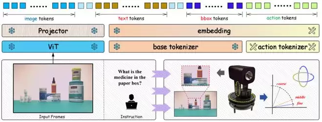 机器人的每个动作,比如向左转 5 度、向上抬 3 度、放大 1.2 倍,都需要被转换成计算机能够理解的格式。杨佳澍等人设计了一种高效的动作编码方式,把连续的动作数值分层编码为基本的动作词,就像我们使用字母拼成单词一样。这样做的好处是,机器人可以使用更少的信息来表达更加精确的动作,同时有更强的语义性,便于模型学习。