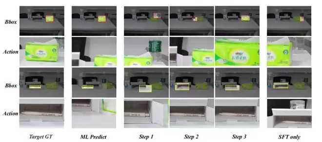 第二个阶段是强化学习。这时,模型开始在真实数据中试错。每当做出一个动作,系统就会根据它是否看得清楚来给出奖励或惩罚。这样一来,就能在复杂场景中让机器人逐渐学会做出更鲁邦的视角调整。
