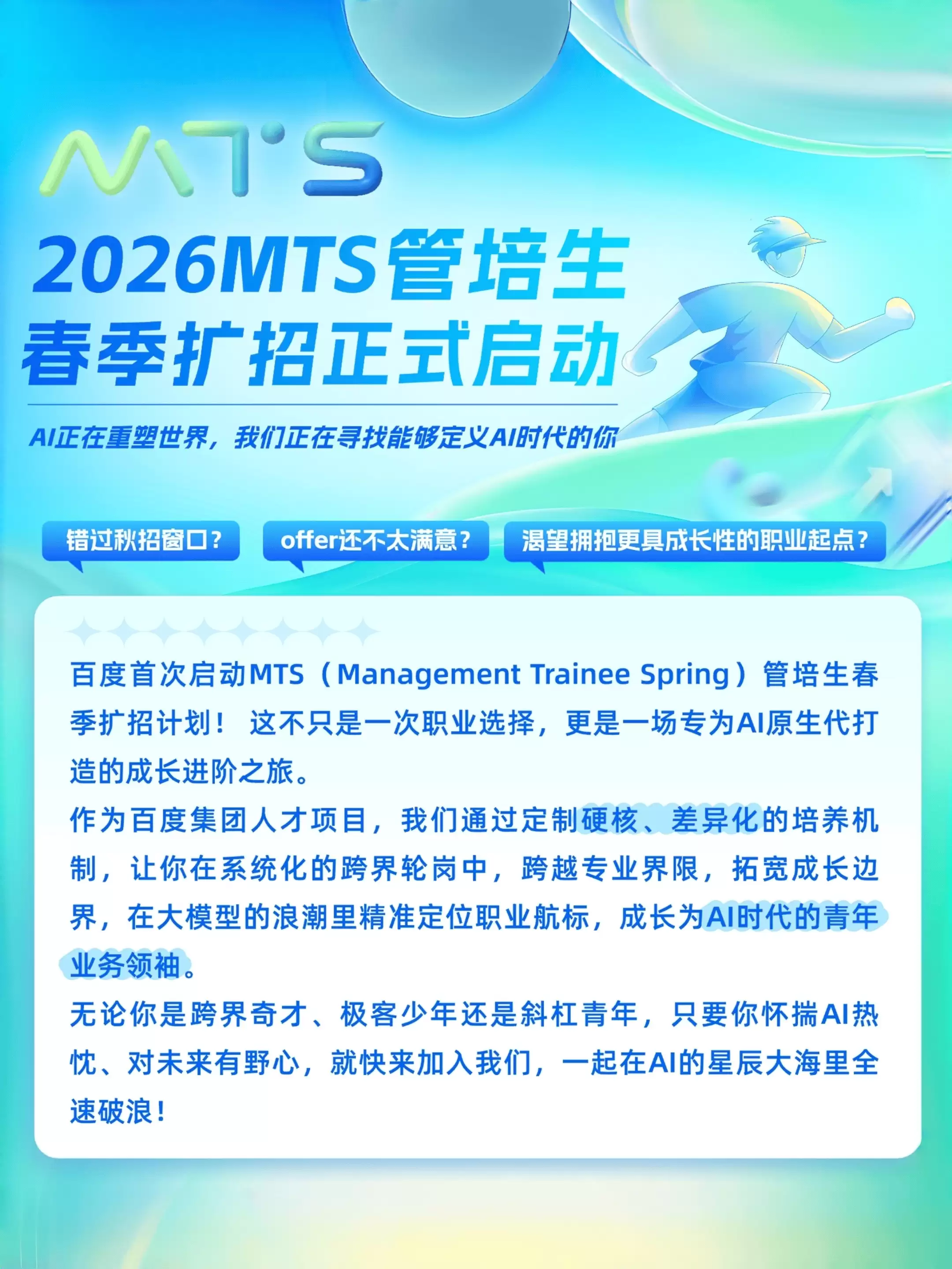百度近日宣布启动2026届MTS(管理培训生春季计划)管培生春季扩招计划,这项顶尖人才项目首次将录用规模翻倍,旨在为AI时代储备更多年轻领军者。根据招聘方案,新一批管培生将接受为期两年的定制化培养,覆盖产品、研发、战略等六大核心领域,并由集团高管直接指导轮岗实践。