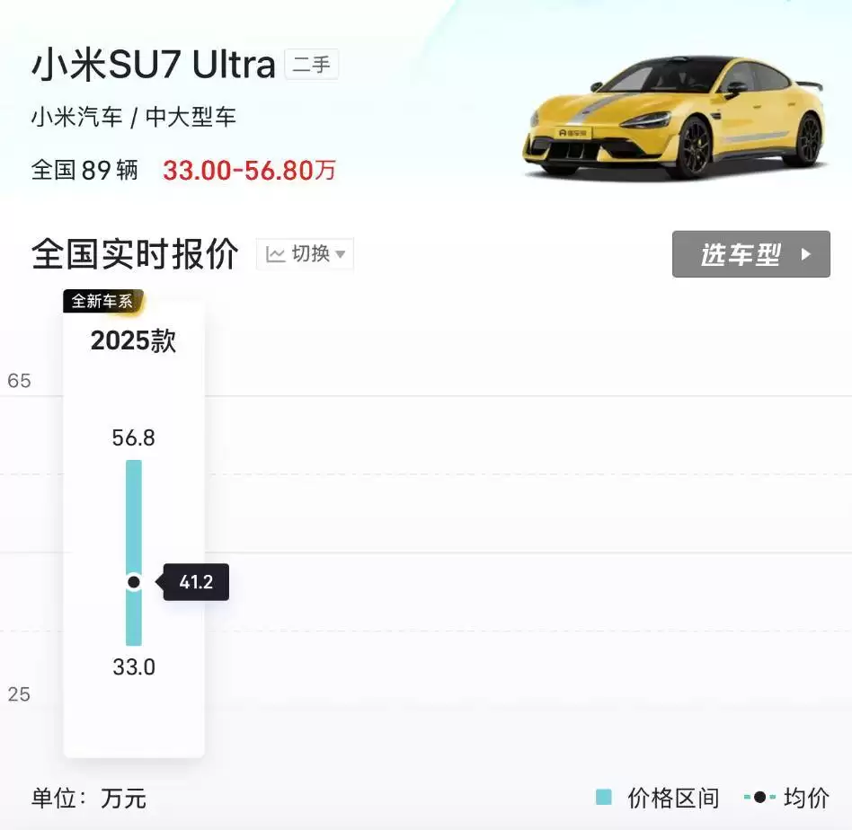 SU7 Ultra的贬值速度更让人意外。作为2025年初上市的高端车型,其新车落地价在53万元左右,而现在全国的二手车均价已经跌到41.2万元。准新车价格普遍比原价掉了10多万,部分行驶一万公里左右的车辆跌幅甚至超过15万元。这种价格“跳水”现象在高端新能源车型中并不多见,引发了市场对其保值率的重新审视。