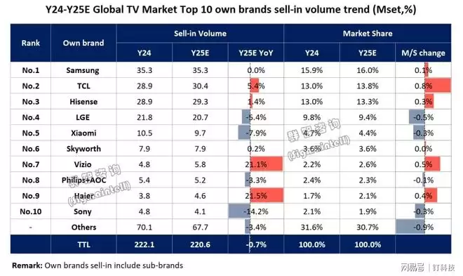 LG电视业务的困境,很大程度上源于中国竞争对手的强势挤压。钉科技注意到,群智咨询、奥维睿沃等机构数据显示,2024年以来,TCL、海信等中国品牌已在全球电视出货量上超越LG,其市场份额面临持续下滑的危机。