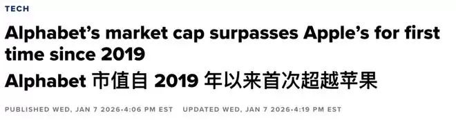 华尔街的鼻子总是最灵敏的。2026年开年,苹果市值跌至3.84万亿,被Alphabet反超,滑落至全球第三。
