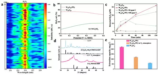 第二个能力是自产“沉淀剂”。聚吡咯本身有一个绝活:它可以充分利用水中的溶解氧,基于一种两电子氧还原反应过程,稳定地生产出过氧化氢,也就是我们消毒时使用的双氧水。这一点非常关键,因为过氧化氢遇到水中的铀离子,会立刻发生“点击化学”反应,生成一种名为过氧化铀的黄色固体沉淀。