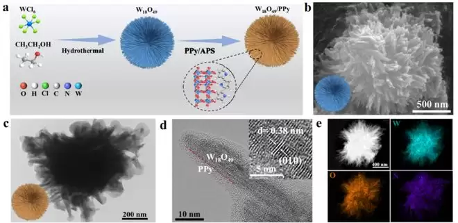 此次突破在于给该电催化剂材料设计了双重功能,赋予了其两条腿走路的本领。他们制造的这种特殊电催化材料,由两种材料巧妙耦合而成:一种是无机物氧化钨,另一种是有机物聚吡咯。氧化钨长成了海胆形状,而聚吡咯则像一层导电的果冻,均匀地包裹在海胆表面。