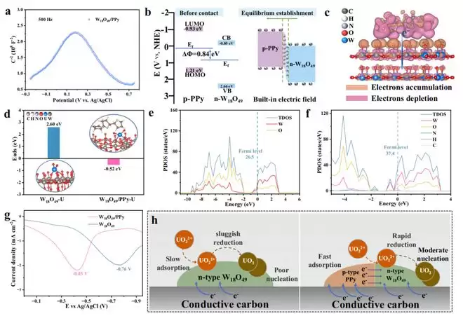 第一个能力是内置电场“吸铁石”。氧化钨和聚吡咯结合后,它们之间会产生一个微小的内置电场。这个电场就像一个定向的电子滑梯,能让电子更顺畅地从聚吡咯流向氧化钨。结果就是,氧化钨表面变得更容易抓住并驯服带正电的铀离子,并将之快速电还原为铀固体产物。简单来说,它让电催化剂对于铀的吸引力更强、抓得更牢固,还原速率更快。