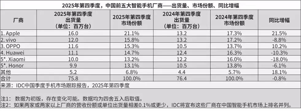 从报告获悉,2025年第四季度,中国智能手机市场出货量约7,578万台,同比微降0.8%,市场表现平稳,苹果、vivo、OPPO位列出货量前三。