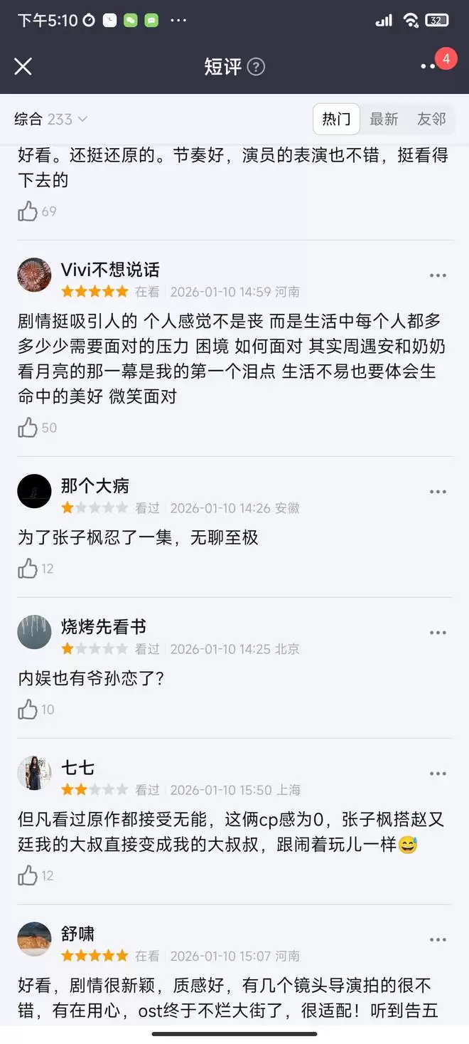 《秋雪漫过的冬天》开播后,口碑呈现出明显的两极分化。支持方认为这部剧捕捉到了真实的生活困境。赵又廷被赞“精准演绎西装革履下的体面崩塌”,张子枫则以眼神诠释了“烂泥中开花的坚韧”。