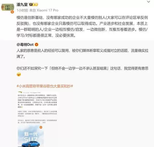 在后续互动中,潘九堂系统阐述了技术创新的发展路径。他认为模仿与创新并非对立关系,所有成功企业都经历过学习借鉴阶段,但单纯复制无法支撑长期发展。他提出“微创新竞争”理论:当行业聚集大量优秀企业时,通过相互启发形成的持续改进将推动整体技术跃升,这种良性竞争最终会提升整个产业的技术水位。
