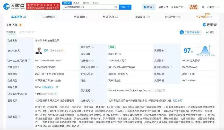 公开资料显示,小米汽车科技有限公司成立于2024年11月,注册资本达10亿元人民币,由小米科技有限公司全资控股。公司法定代表人由小米集团创始人雷军担任,业务范围覆盖新能源汽车整车制造、汽车零部件技术研发、电机及控制系统开发等多个核心领域,形成了完整的智能电动汽车产业链布局。