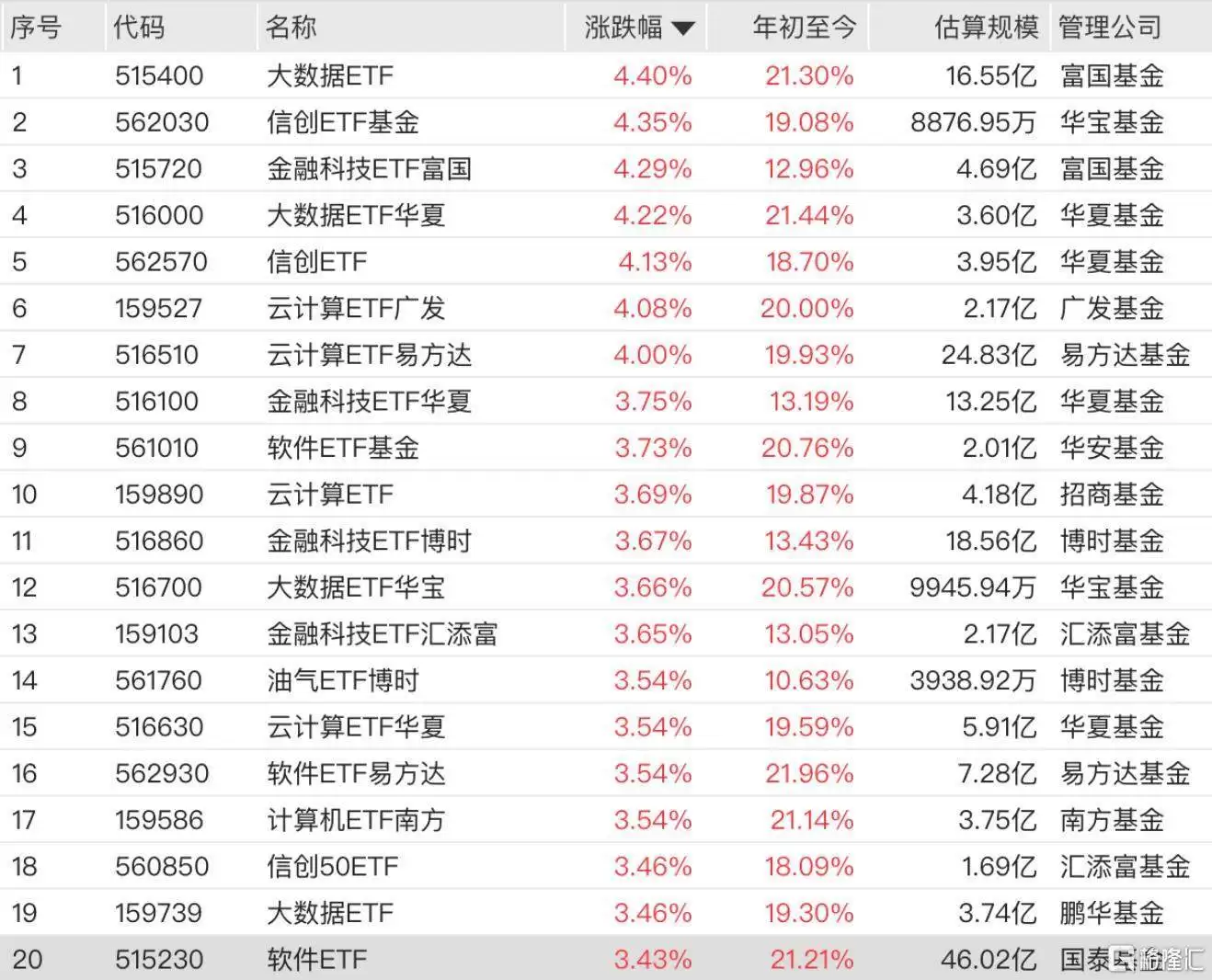 A股市场今日波动显著,AI相关板块成为领涨主力。多只ETF产品表现亮眼,大数据ETF、信创ETF基金、金融科技ETF富国等涨幅均超过4%,云计算主题ETF也集体走强,广发、易方达旗下产品涨幅居前。