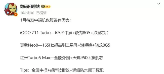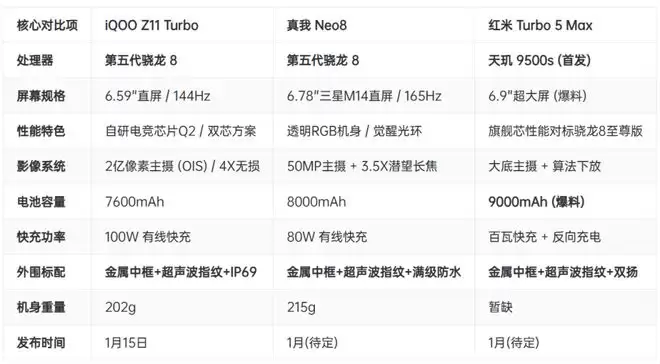 那么就根据目前掌握的一手爆料和供应链信息,帮大家深度复盘即将于1月登场的三款性能猛兽:iQOO Z11 Turbo、真我Neo8、红米Turbo 5 Max。