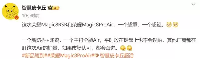 不得不说,荣耀这次的发布会预热确实把反差感玩明白了,一边是重装上阵、武装到牙齿的Magic8 RSR保时捷设计,另一边则是轻盈如羽、甚至放在键盘上都不会产生误触的Magic8 Pro Air。