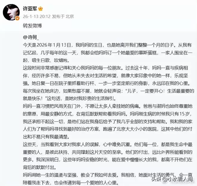 时间飞快,直到2026年1月13日,何晴去世已经整整一个月了,许亚军才终于表态,让一切尘埃落定。