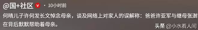 许何同时公开致谢父亲许亚军与继母张澍,直言二人在母亲十年抗癌路中,给予了自己“莫大的支持与帮助”。