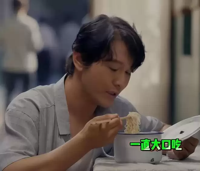 但让人看懵的是,刚做完烫嘴的动作,他下一秒就夹了一大筷子面往嘴里塞,狼吞虎咽地吃了起来,嘴里塞满面条还含糊不清地念叨工作。
