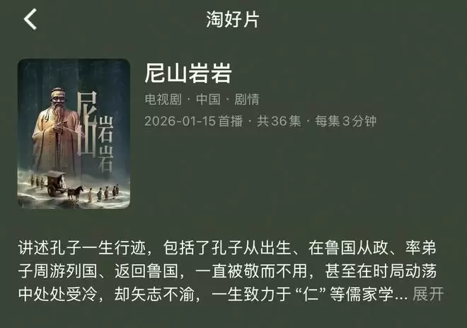 1月15日,36集AI微短剧《尼山岩岩》上线优酷。这部剧讲述了一个关于成长、理想与坚守的故事,主角名为孔子。